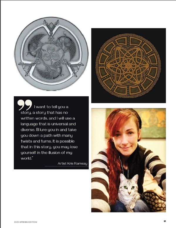 Kris has always maintained a deep connection to her Scottish roots. During her teenage years, she became captivated by the intricate geometric patterns characteristic of Celtic Art. Motivated by this fascination, Kris dedicated herself to mastering and developing her skills, producing distinctive designs that invite viewers to explore the dimensional illusions in her work, which appear carved from natural materials rather than painted. Kris dedicated efforts to crafting relief designs on various works, aiming to bring Celtic patterns to life and enable visually impaired individuals to appreciate them through tactile interaction.